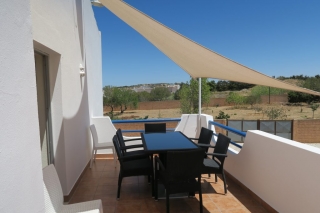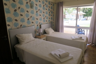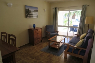 All one bedroom apartments are situated on the ground floor with views to the gardens and pools.  Complete with equipped kitchen, bathroom (some with bath/shower and others a walk-in shower, bedroom, lounge/dining room.  Each has its own terrace leading off the lounge with table and chairs. Suitable for up to 2 adults and 2 children. (Small fold out beds can be hired for up to 11 years only). Some apartments have wheelchair accessibility. Approx. area 55 m2.