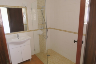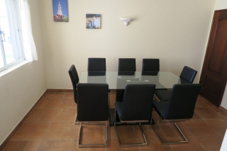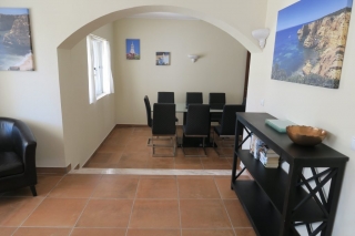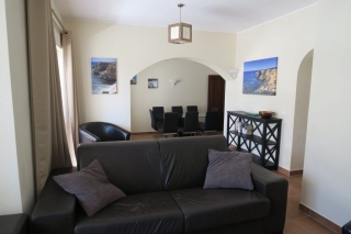 The villa can sleep up to 8 adults.  It has a double and twin room upstairs with shared bathroom. Two terraces, one with table and chairs for outside dining. Downstairs has a double bedroom with an ensuite shower room and a third double room with full bathroom and its own terrace.  A well-equipped kitchen with washing machine. Lounge with TV (UK channels), dining room with terrace leading out to the gardens.   Other extras included.